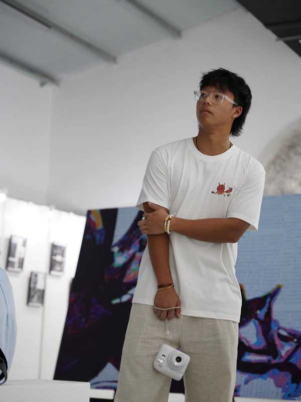 作为数字时代的少年,安迪对展览的呈现方式同样充满创新构想。他巧妙地将实体作品与数字影像技术相结合,打破传统画展的静态观看模式。展览空间不再仅仅是悬挂作品的“白盒子”,而是化身为由特殊“影像墙”构建的沉浸式场域。安迪希望这些墙能成为与朋友、家人乃至所有观众深度互动的媒介,共同营造一个包裹感官、激发共鸣的艺术体验空间,让每一位步入其中的人都能成为这个“艺术作品展”的一部分。